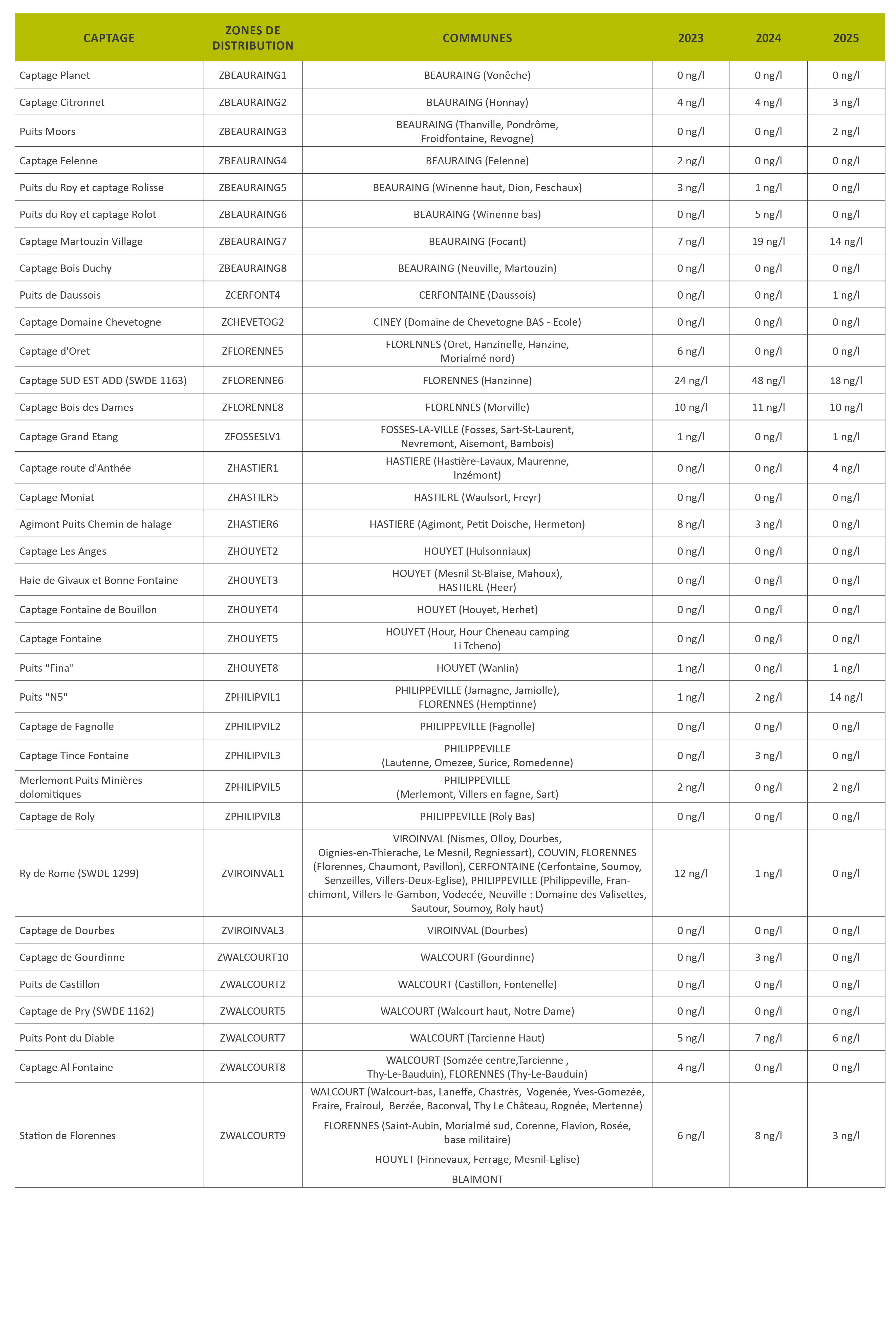 Ce programme d’analyse systématique sur l’ensemble des prises d’eau était programmé en 2024, en accord avec la Région wallonne. Il a été décidé d’anticiper en 2023 ce programme d’analyse. Les résultats devraient être disponibles dans les prochaines semaines.